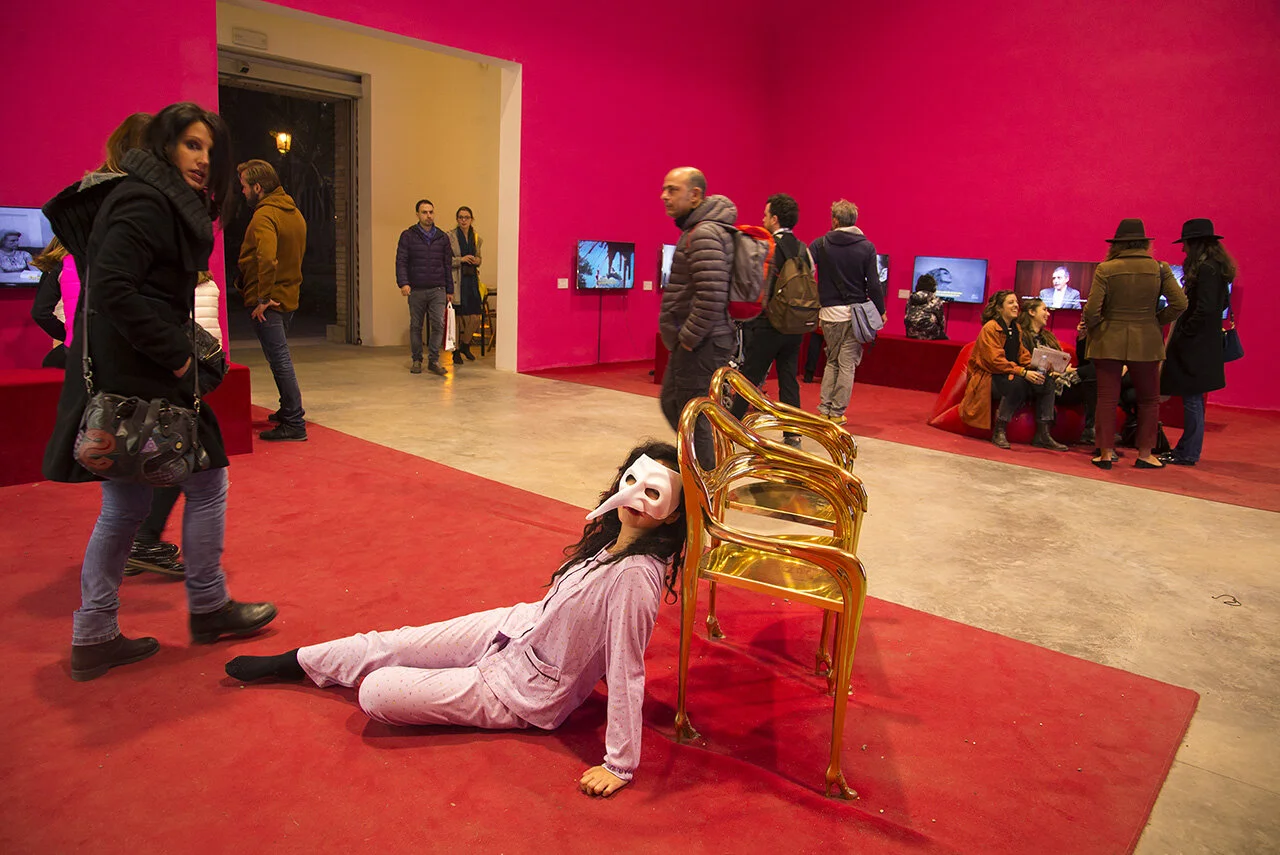 2015年至2017年期间,炭叹炮制了这场山寨威尼斯双年展。她通过在双年展内陈设未受邀的艺术家的作品、四处与“圈内人”合影、制造假新闻,甚至自己建了一个官网等方式,成功实现了她获奖的“事实”,并“欺骗”了绝大多数的人。