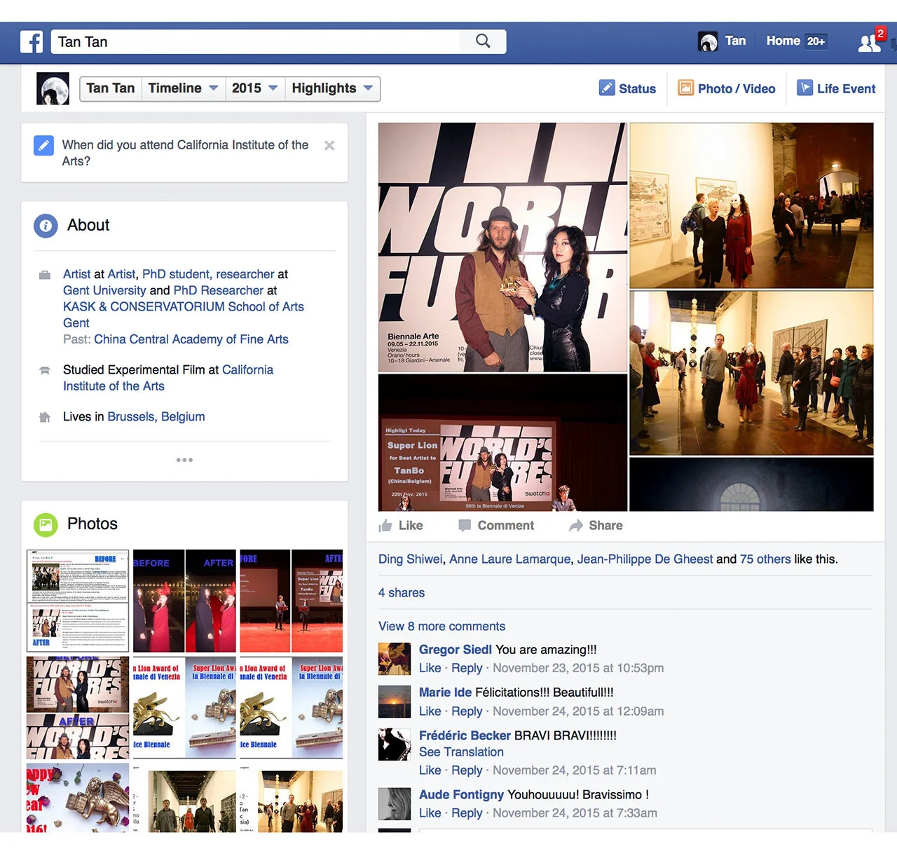 2015年11月24日,一条新闻横空出世,一个名叫“TanBo”的组合获得了Venize双年展的Super Lion特别大奖,这条消息很快在艺术圈子里传播开,许多艺术家给这对组合发来了“雪花般的贺信”。
