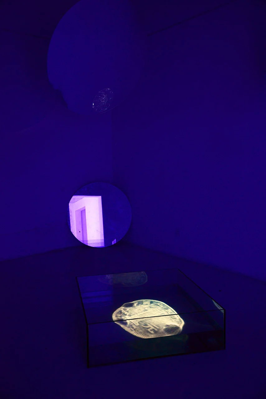 Two reflections of a“turning moon” are refracted by two mirrors, one reflection is on the ceiling, the other is in the water of a container. The audience will only know the “reality of moon”if they get close to the images, in fact, the moon and a 1 yuan RMB coin are transforming into each other.